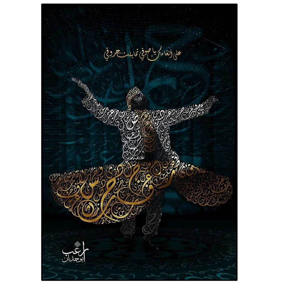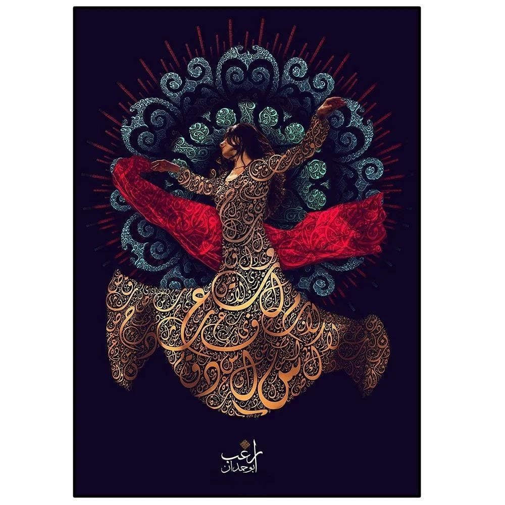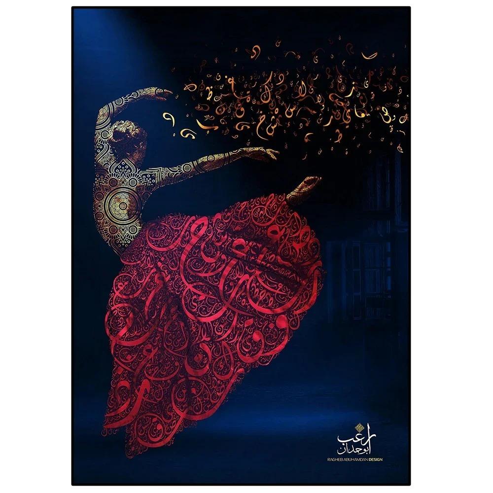 لوحة الخط العربي تجمع بين الفن التجريدي والألوان الزرقاء العتيقة، مزينة بصورة راقصة بفستان أحمر. تصميم فني مميز يضيف لمسة عصرية وأنيقة لديكور المنزل أو المكتب.